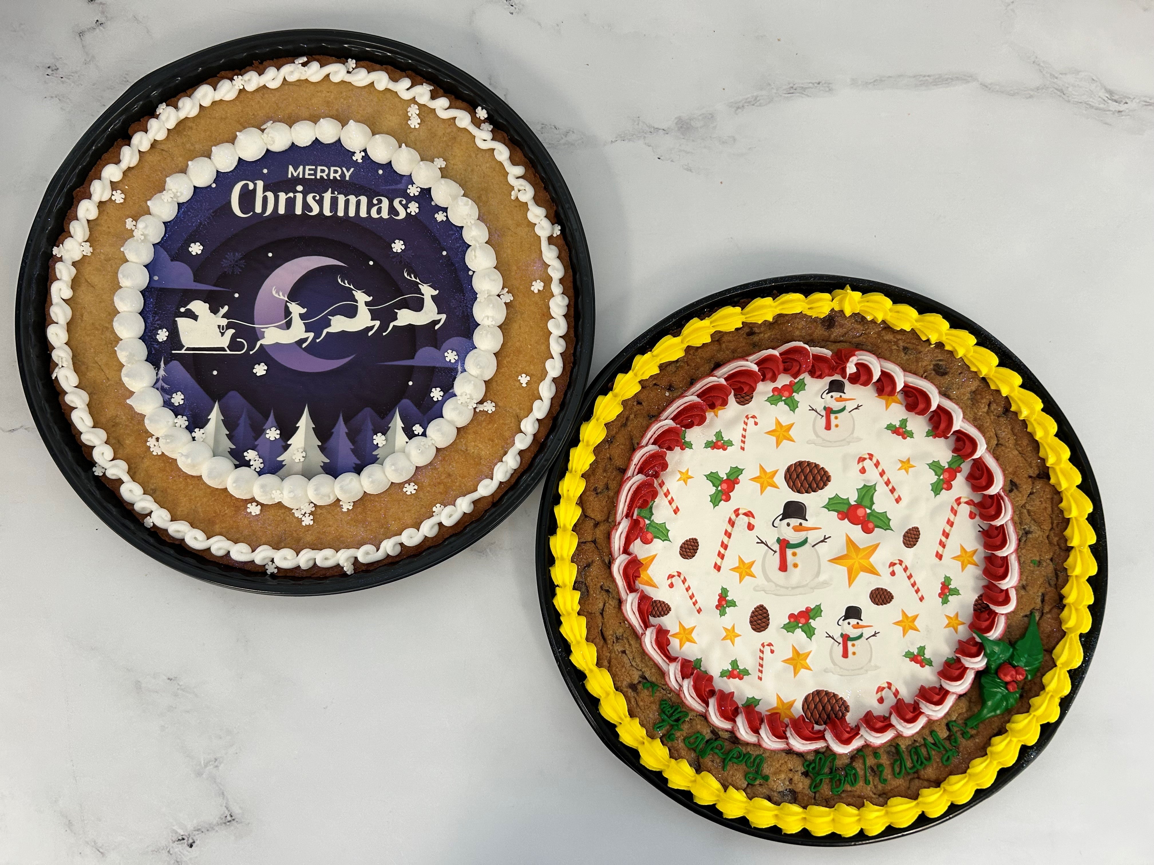Your favorite Giant Chocolate Chip Cookie decked out for the Holidays in one of two designs