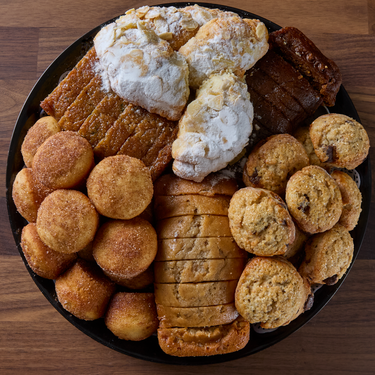 An assortment of mini-muffins and sweet breads, almond crescents, danish, and cinnamon rolls. The Large Breakfast Tray also includes a freshly baked bundt cake.